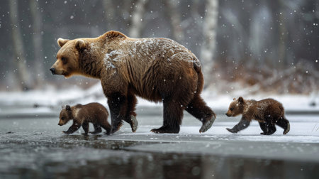 A mother bear leading her cubs across a frozen stream, the soft snowfall adding a magical quality to their winter journey, showcasing the protective instinct and tender care within the animal kingdom.