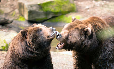 close-up portrait of two big brown bears fighting with mouthes open with teeth and paws with claws looking aggresive