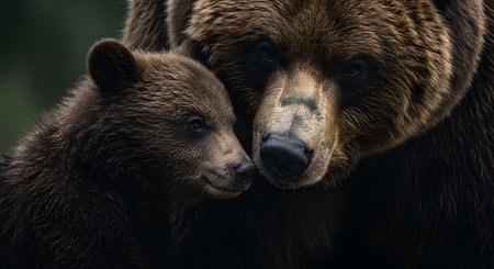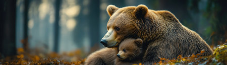 Bear with cub in forest side view natural lighting gentle closeness wild parental moment