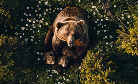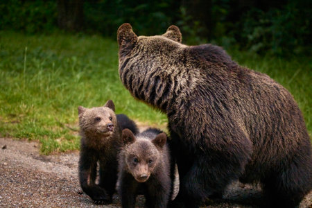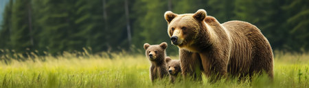 Protective brown bear mother with two cubs standing in a lush green meadow
