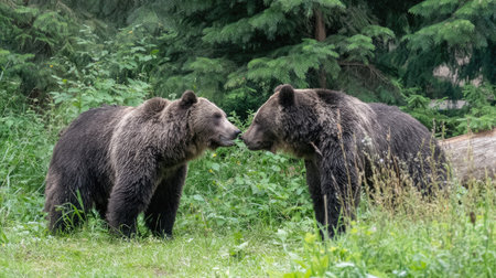 Two brown bears stand face to face amidst a forest setting. The bears' fur exhibits shades of brown and gray. The composition highlights the animals against a backdrop of green foliage. This scene is suitable for use in educational materials or wildlife-themed publications.