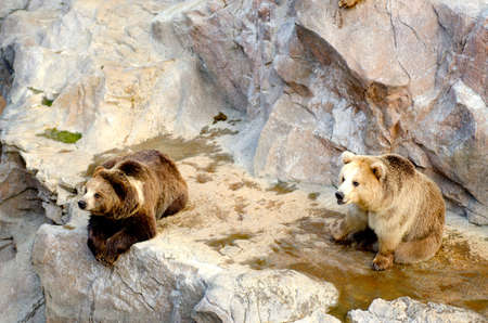A pair of wild brown bears on the riverbank. Two bears standing in the water, one on the left and one on the right