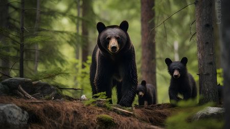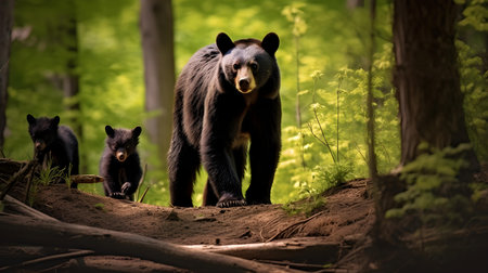 A Black Bear Mother and her Cubs in the Forest