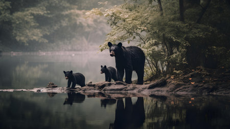 A Black Bear Mother and her Cubs in the Lake