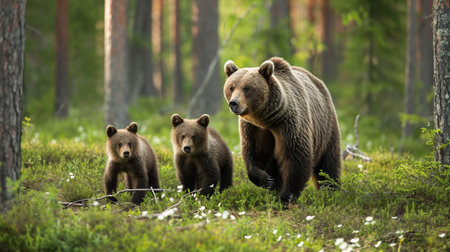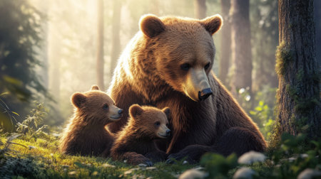 Mother bear and her cubs playing in the forest, sharing a tender moment in the wild, capturing the beauty of nature bond.