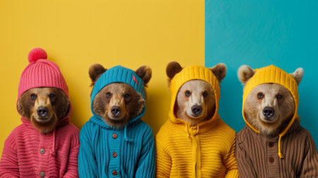 Four bears are wearing hats and jackets and standing in a line