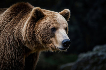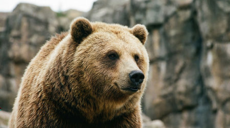 A close up shot of a powerful brown grizzly bear with thick fur looking thoughtfully to the side against a blurred rocky mountain background.