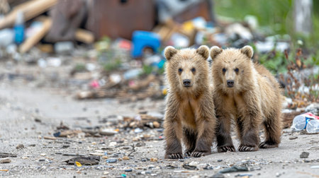 Curious baby bears inspecting garbage, looking at camera on blurred background with space for text