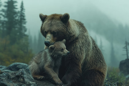 Grizzly bear and her cub showing affection in their natural habitat, a foggy forest
