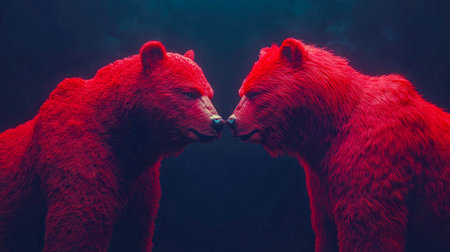 Digital illustration of two stylized bears representing a bearish trend in cryptocurrency, set against a backdrop of red holographic digital lines and data.