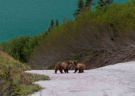 Two Grizzly Bears On Snow Field lingering in Montana summer