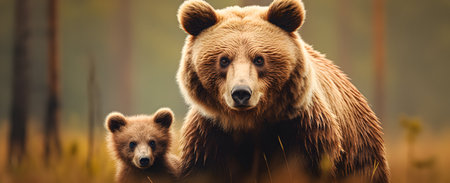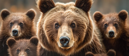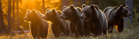 Brown bear family standing in front of the camera in the forest with setting sun. Group of wild animals in nature. Horizontal, banner.