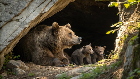 A mother grizzly bear and her cub are seen resting closely together in their natural habitat, surrounded by rocky terrain and greenery. Generative AI