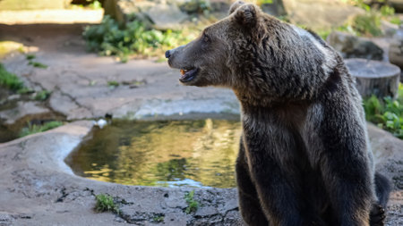 Large hairy bear sits in spacious enclosure in menagerie basking in fine weather. Big animal enjoying simple pleasures of life under sun in zoo