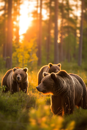 Brown bear family standing in front of the camera in the forest with setting sun. Group of wild animals in nature.