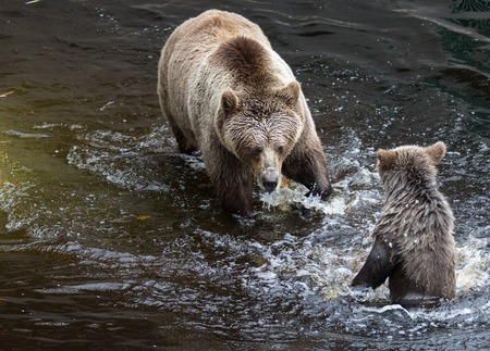 Cute family of brown bear mother bear and its baby playing in the dark water Ursus arctos beringianus . kamchatka bear
