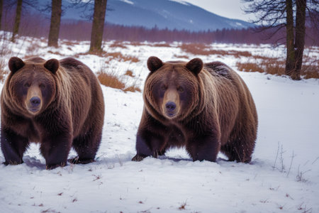 Two brown bears playing outdoors on snow in wild nature forest