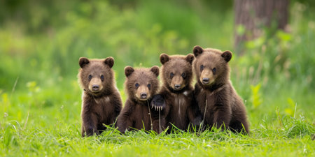 Four Adorable Brown Bear Cubs Standing Together on Lush Green Grass