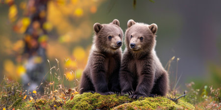Autumn Companions: Two Brown Bear Cubs in a Forest Clearing Amidst Fall Foliage