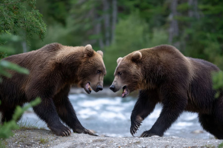 Two grizzly bears face each other, displaying aggressive postures by a flowing river surrounded by trees.