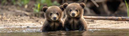 Two bear cubs playfully interact by a lake