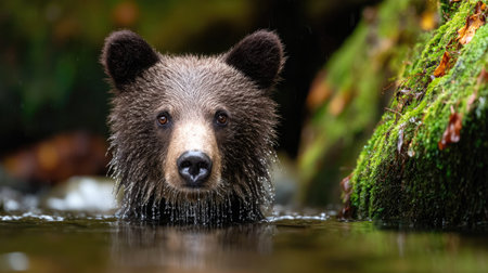 Close-up of a brown bears face with raindrops, showcasing its serene expression
