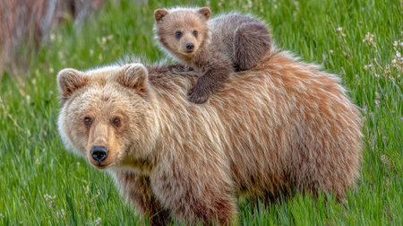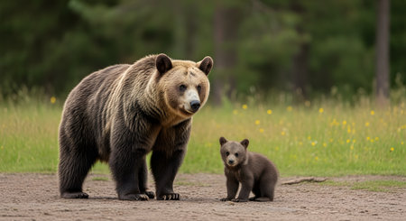 AI-Generated image of a powerful grizzly bear standing protectively beside its cub in a lush green meadow. The adult bear’s thick brown fur and strong presence contrast with the smaller cub’s softer, lighter coat.