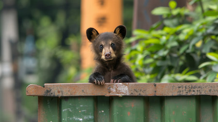 Curious bear cub inspecting garbage with room for text, focus on camera, blurred background