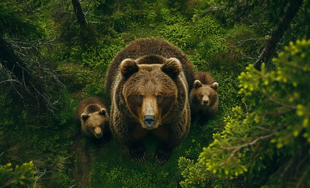 Brown bear with cubs in the summer forest. Top view.