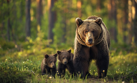 Female Eurasian brown bear and her cubs in boreal forest