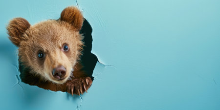 Advertising portrait, banner, brown forest bear looking directly at the camera with a serious look, isolated on a blue background. Generated AI. high quality illustration