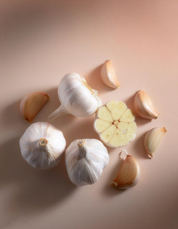 Fresh Garlic Bulbs Laying on Ground, Illuminated by Soft Light