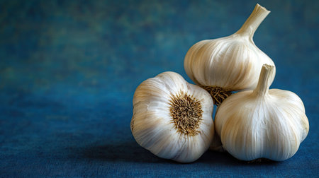 This image features three fresh garlic bulbs on a textured blue background. The vibrant colors highlight the organic beauty and culinary value of garlic in cooking and healthy meals.
