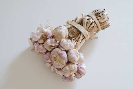 Garlic purple stalk on a white stone background. A lot of empty space.