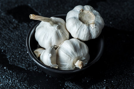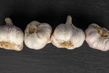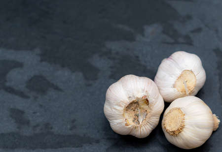 Close up three whole garlic bulbs isolated on black stone table background. Flat lay. Top view. Food photography concept.