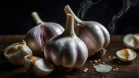 Rustic setup of fresh whole garlic bulbs on dark wood with soft shadows and room for text