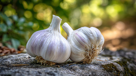 Fresh Garlic Bulbs on Stone Surface with Natural Green Background