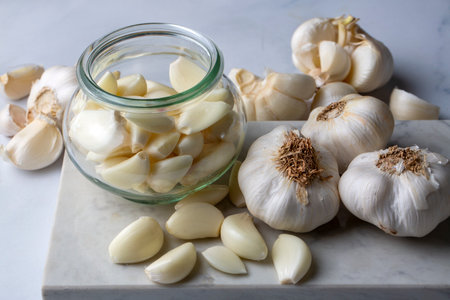 Garlic cloves in a glass bowl with peeled garlic on a white marble table.