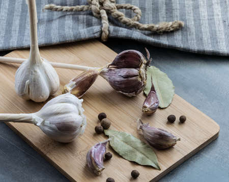 Fresh sliced ??garlic on a wooden board with colored pepper and bay leaf ready to flavor