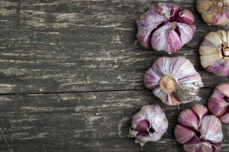 ripe dry heads of garlic lie on a gray old shabby wooden background in natural daylight. Artistic creative mockup in rustic style with copy space. top view