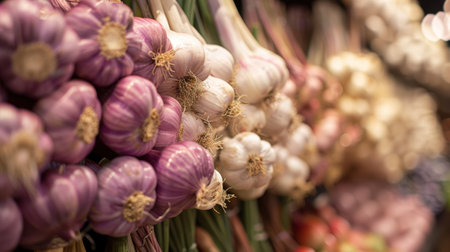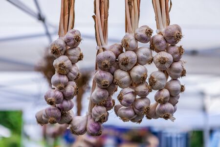 Close-up of bunches of fresh purple and white garlic hanging in a market, showing their natural texture and vibrant colors.