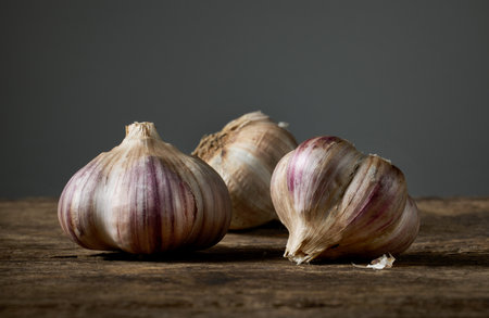 Three fresh garlic bulbs resting on wooden surface create a still life.