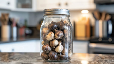 A glass jar filled with black garlic cloves, showing their glossy, aged texture and deep color, on a kitchen countertop.