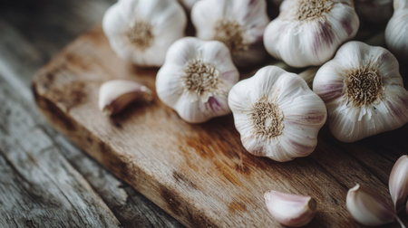 A collection of fresh garlic bulbs displayed on a rustic wooden board, showcasing their natural beauty and texture, perfect for culinary creations.