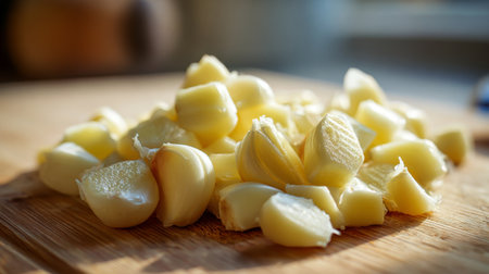 A vibrant display of freshly chopped garlic cloves on a wooden cutting board bathed in sunlight, ideal for culinary creations and healthy meal preparations.
