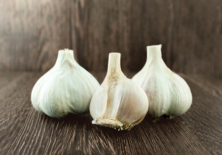Garlic bulbs on a wooden background. Close-up. Selective focus.
