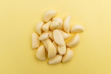 Garlic cloves and pieces of raw garlic on isolated white background. Top view Garlic bulbs.