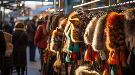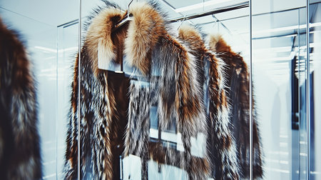 Luxurious fur coats hang perfectly arranged in a boutique, showing intricate textures and rich colors that evoke sophistication on a crisp winter night.