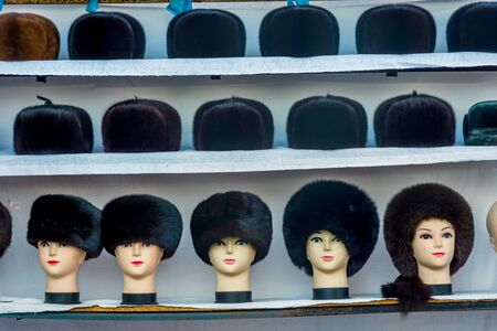Black fur hats for sale at the Kumtepa bazaar, Margilan, Uzbekistan