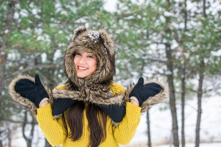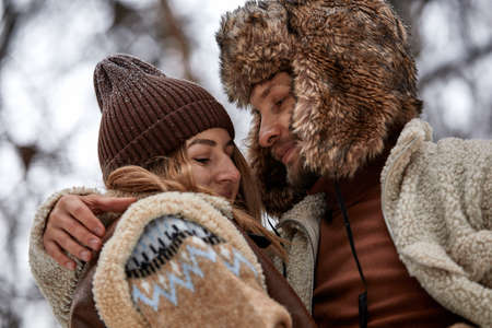 Close-up of a woman in a fur hat made of natural or artificial fur. A wild female look through the wool. snow and winter season.